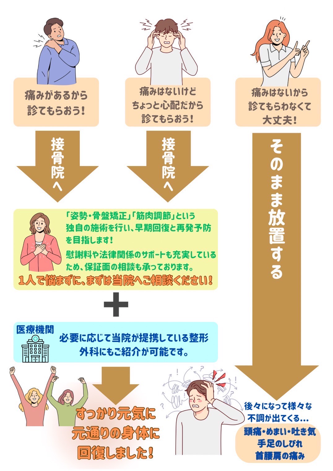 交通事故後の治療が遅れてしまうと、症状が長期化してしまったり中には後遺症として残ってしまうこともあります。