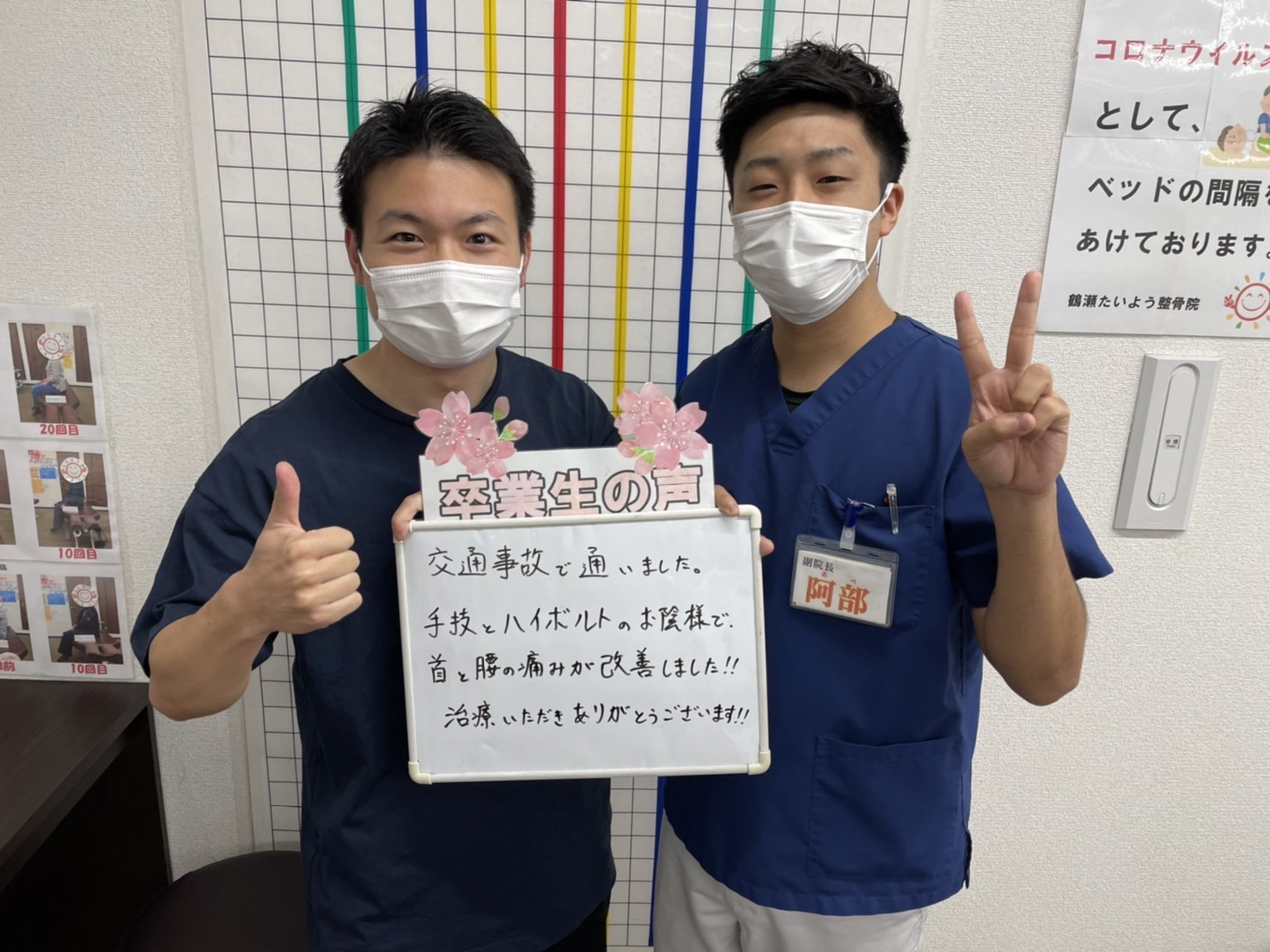 交通事故で通いました。手技、ハイボルトのおかげで首、腰の痛みが改善しました。治療いただきありがとうございました。